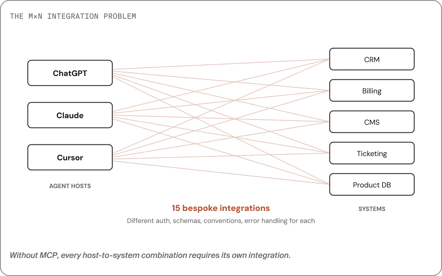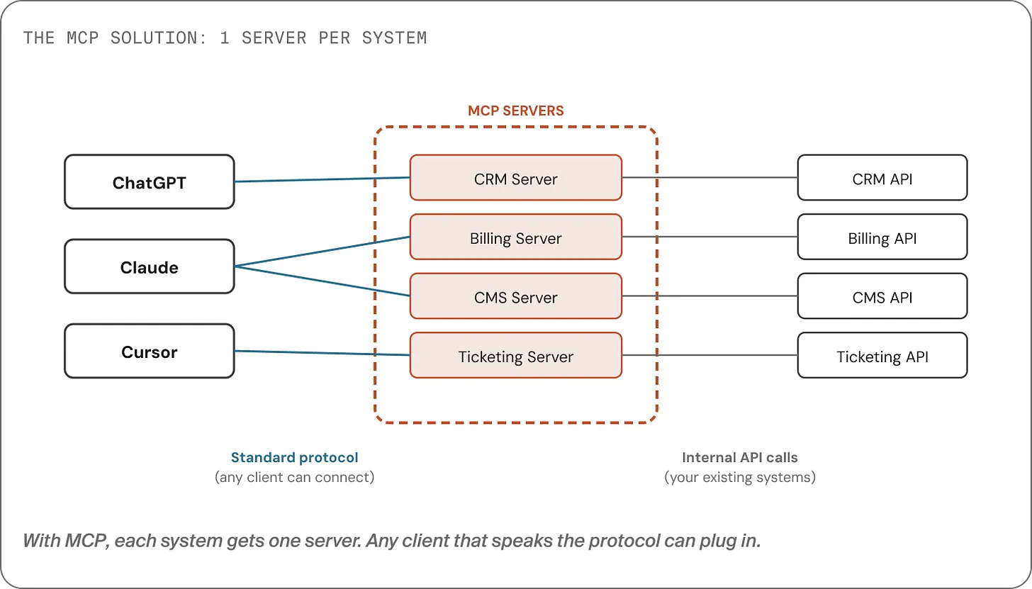 If you have M agent hosts (ChatGPT, Claude, Cursor, your own app) and N backend systems (CRM, billing, ERP, knowledge base…), you end up with M×N integrations to build and maintain.