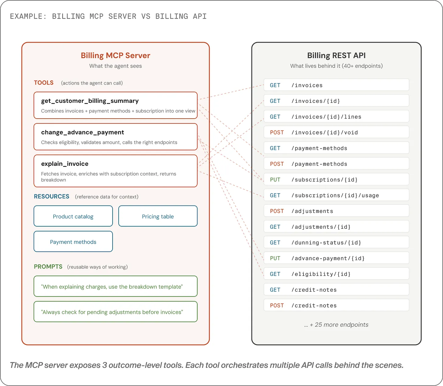 - It’s a capability contract for agents: small, discoverable, outcome-oriented tools.