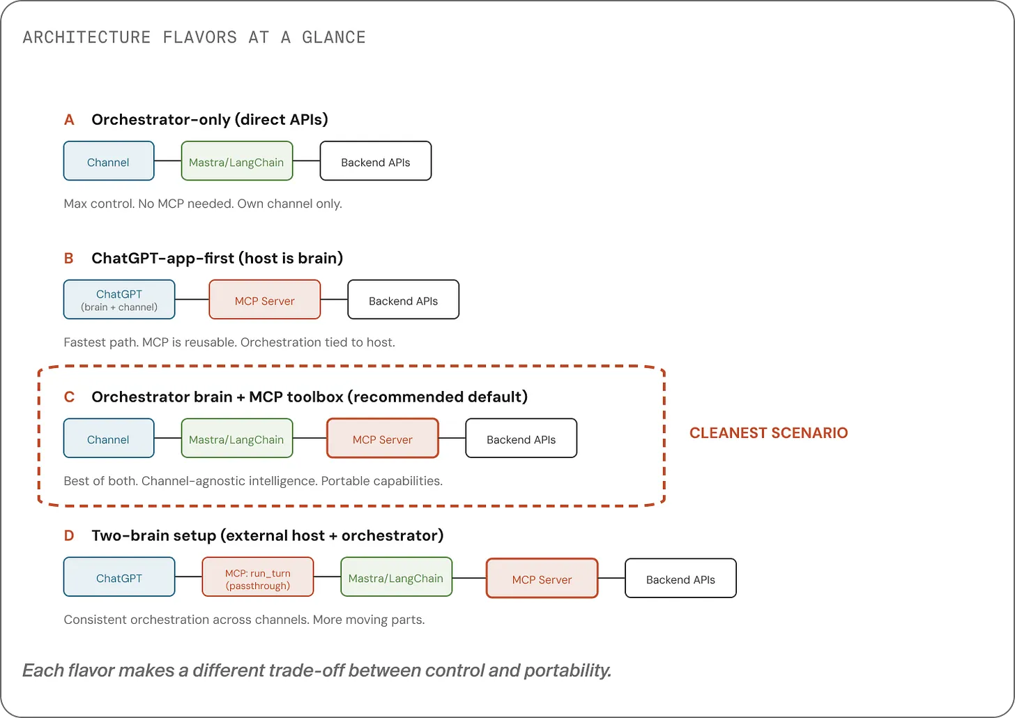 - Two-brain / passthrough: external host calls one MCP tool that forwards to your orchestrator (best consistency across external channels, more setup).